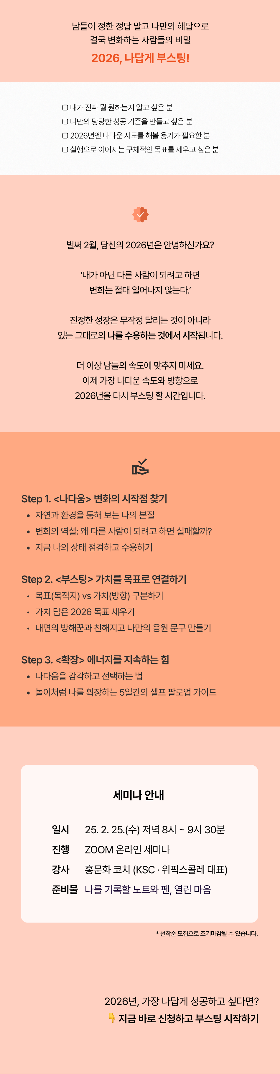3️⃣ 단순한 목표 달성을 넘어 내 삶의 방향성(가치)과 연결된 지치지 않는 2026년의 실행 에너지를 얻습니다.